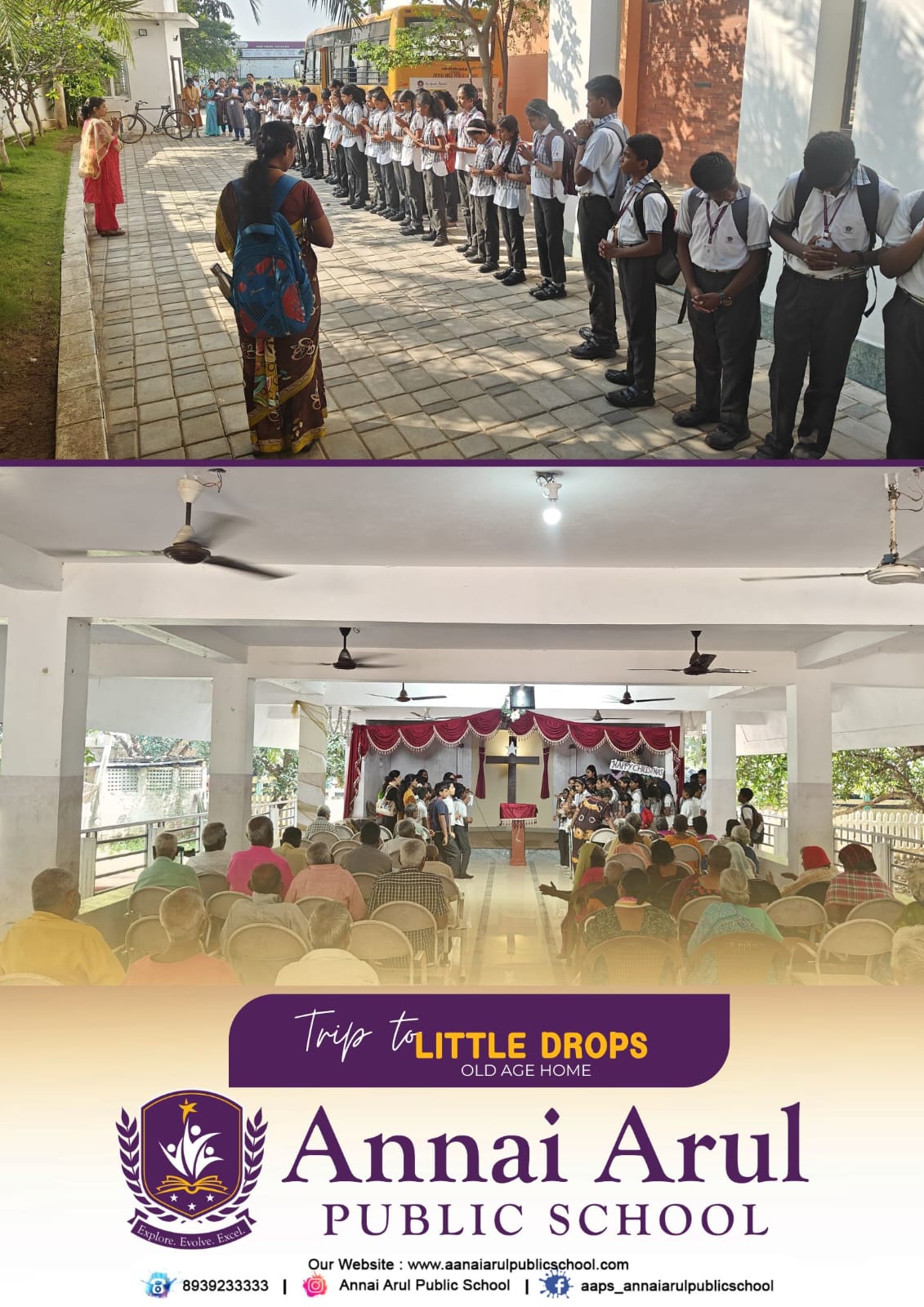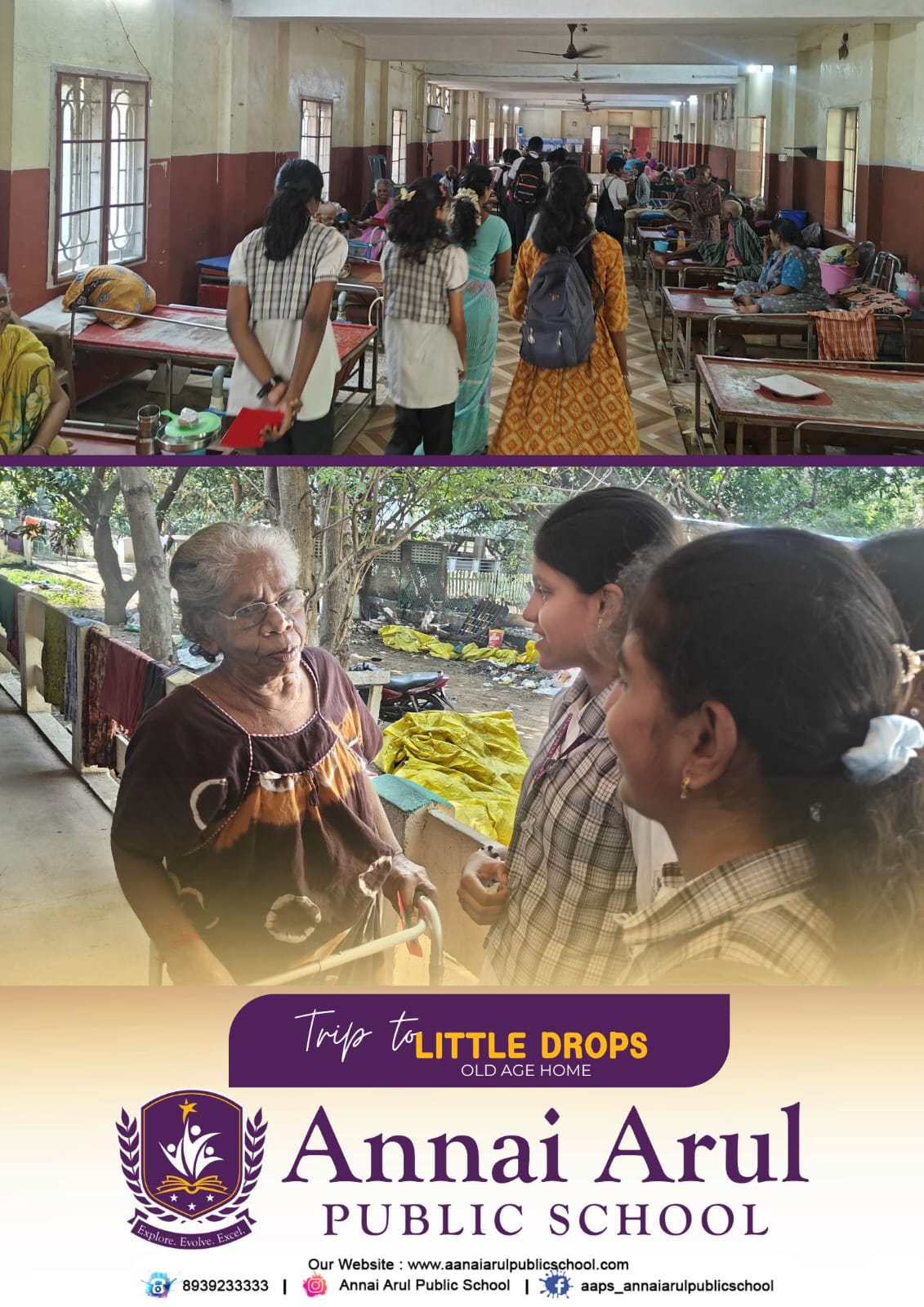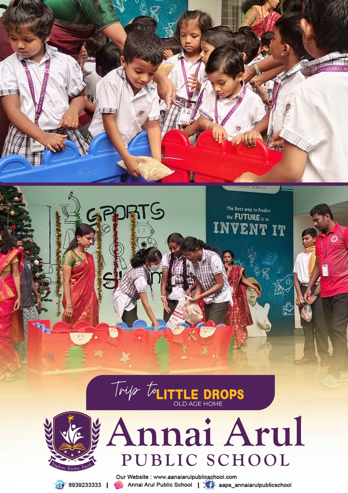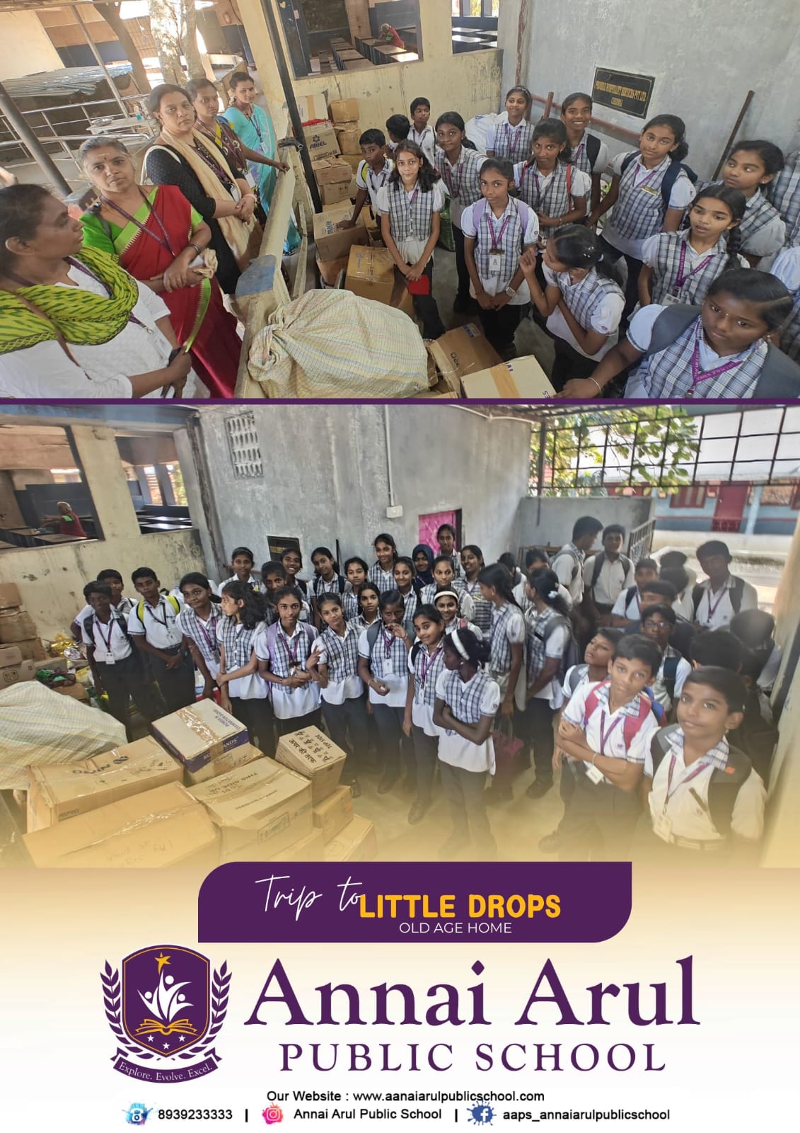 As part of the Joyful Giving Initiative at Annai Arul Public School, our students and parents came together in a beautiful display of generosity and compassion. Through a well-organized donation drive, they collected food grains and essential items to support the elderly residents of Little Drops Old Age Home.