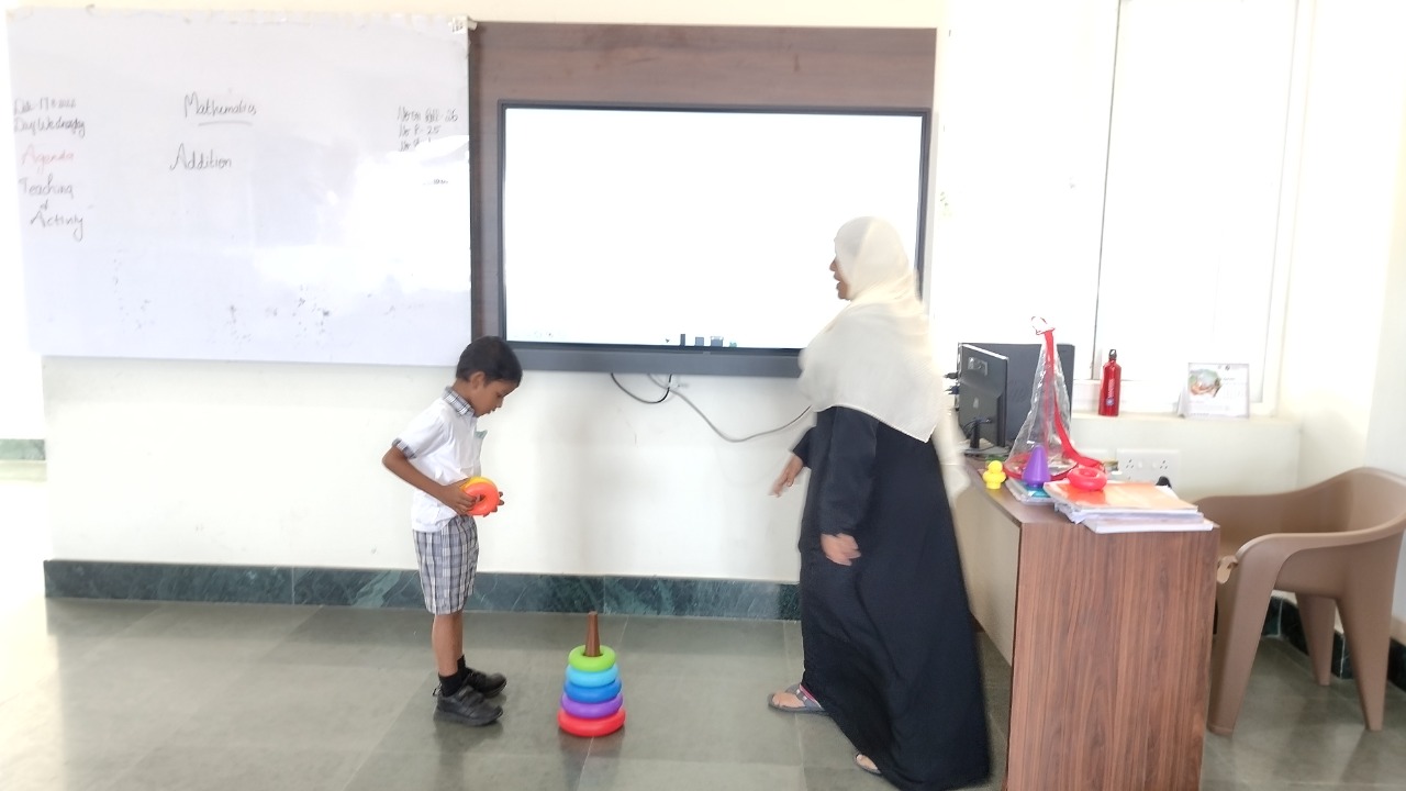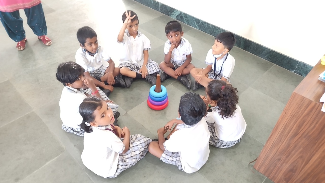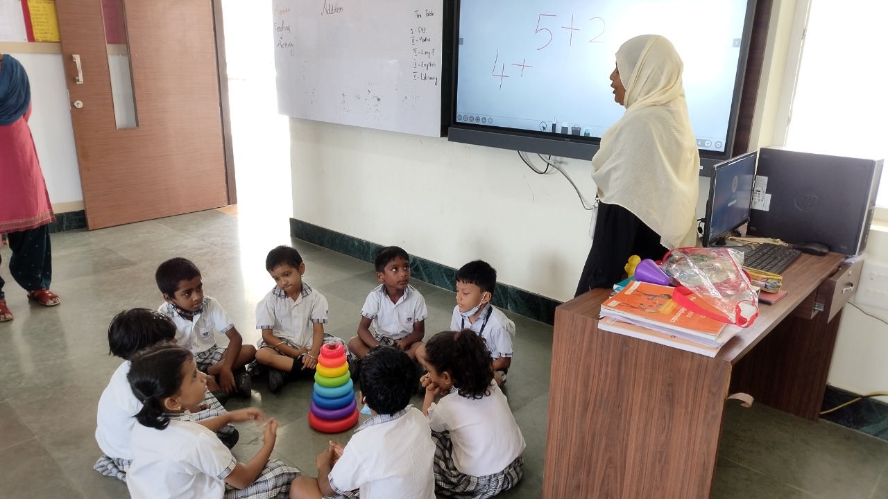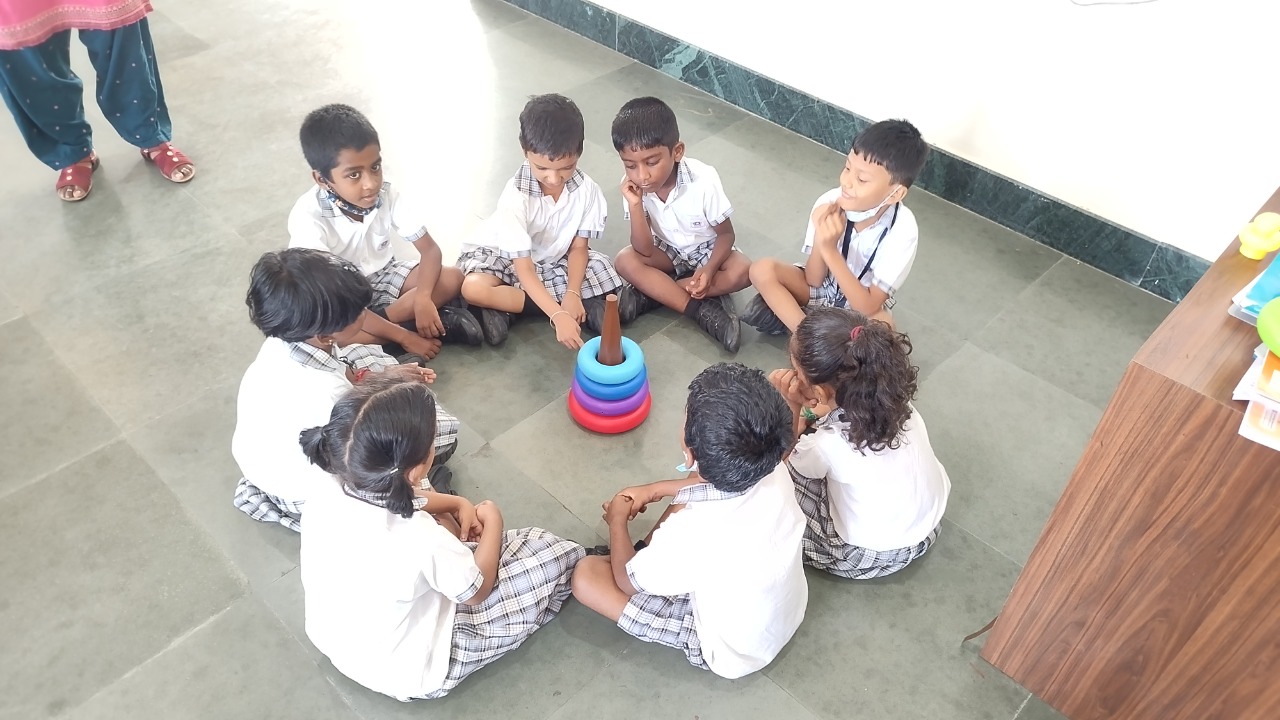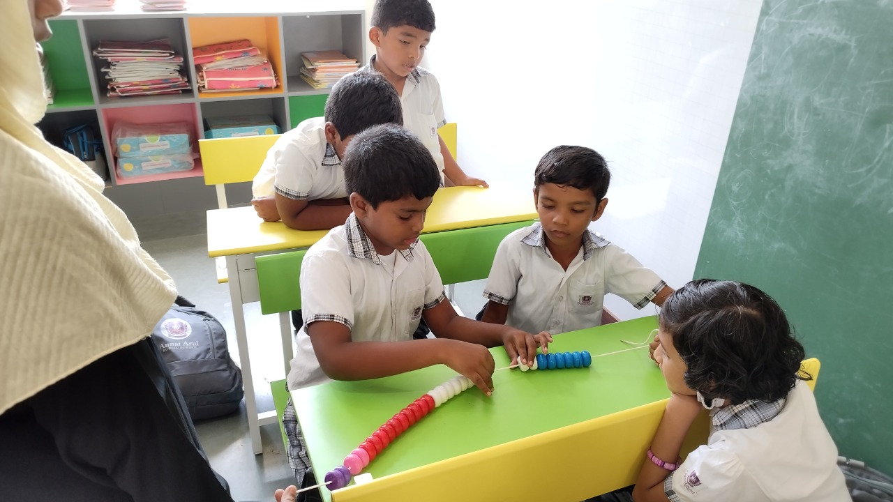Children were made to count ten coloured rings (addition) by forming groups and were made to do the activity in pairs by taking away (subtraction) two digits from two digits using tens with beads. Students were made to stick the stars individually for repeated addition (multiplication) to form a table of 2. Students grasped easily the four basic operations of mathematics. They also learnt the applications of each of these operations in a simpler way.