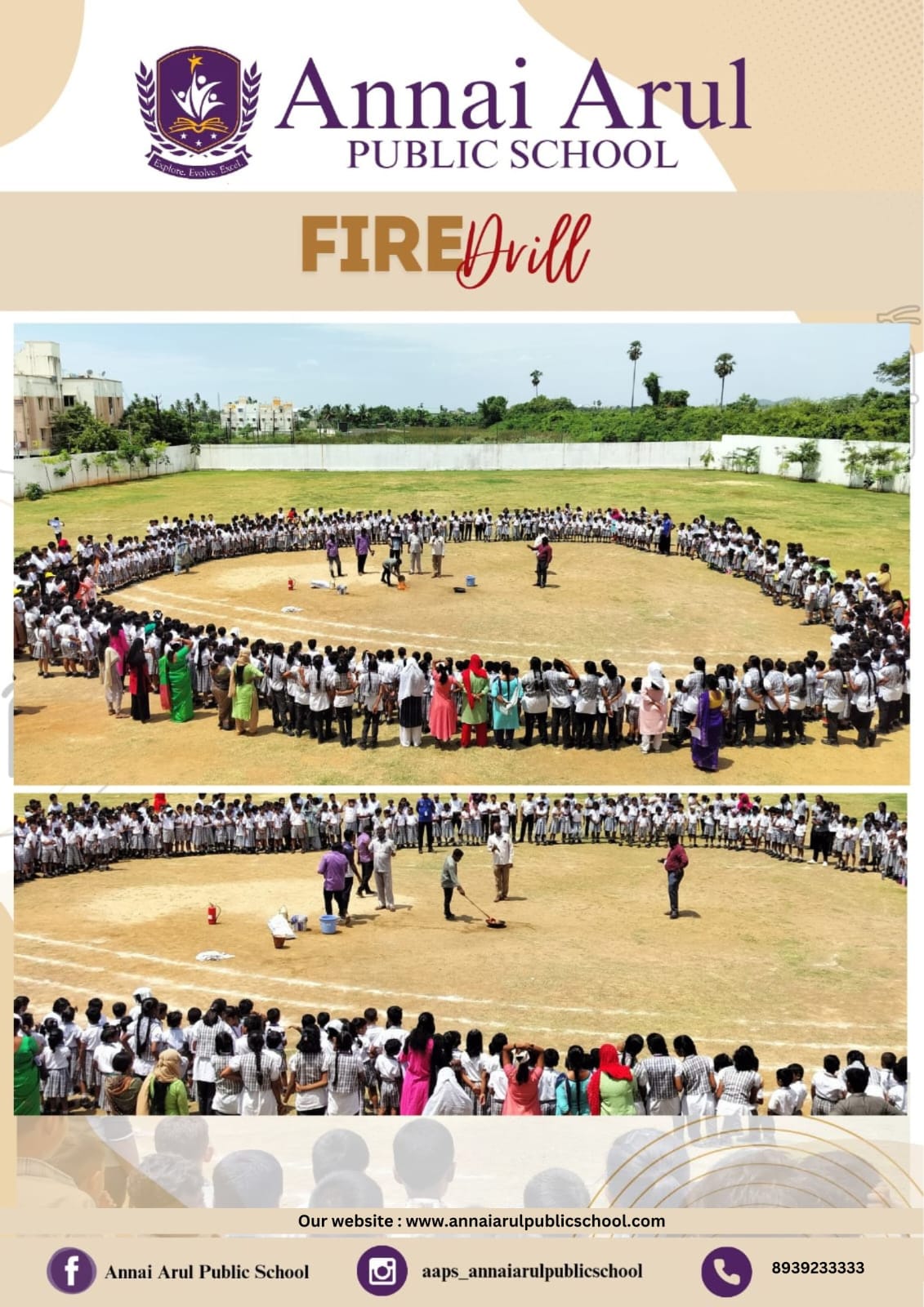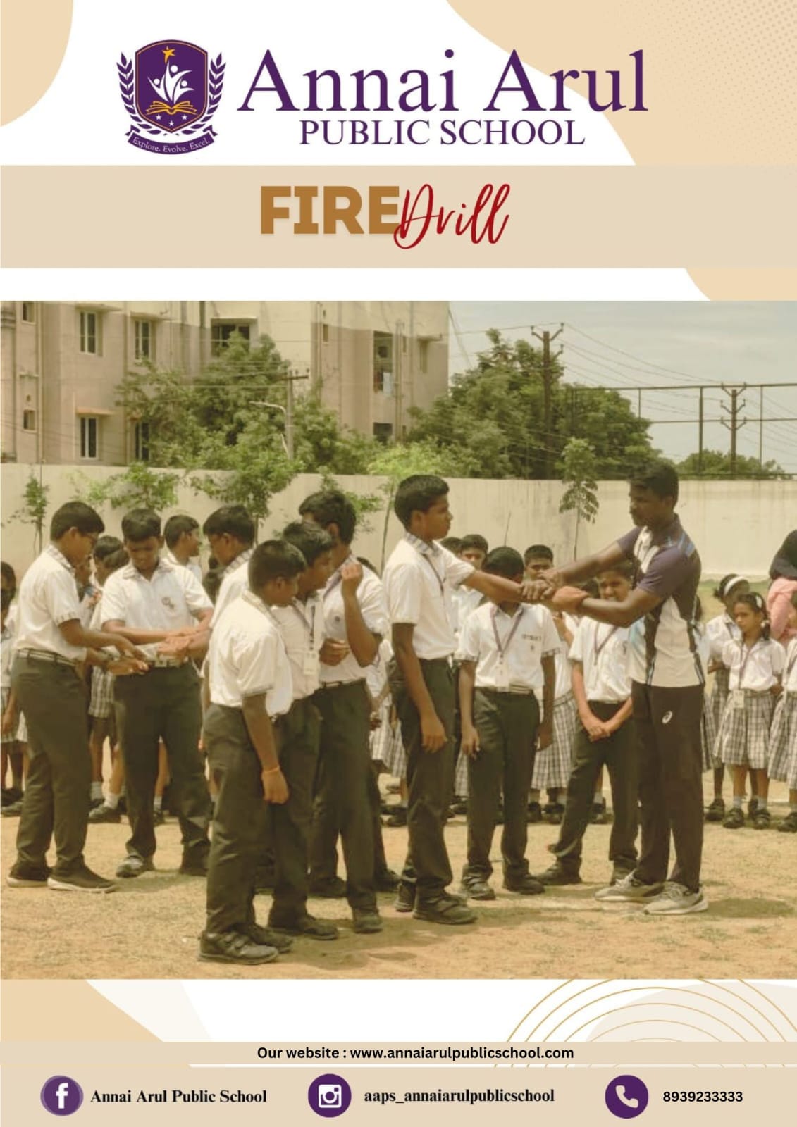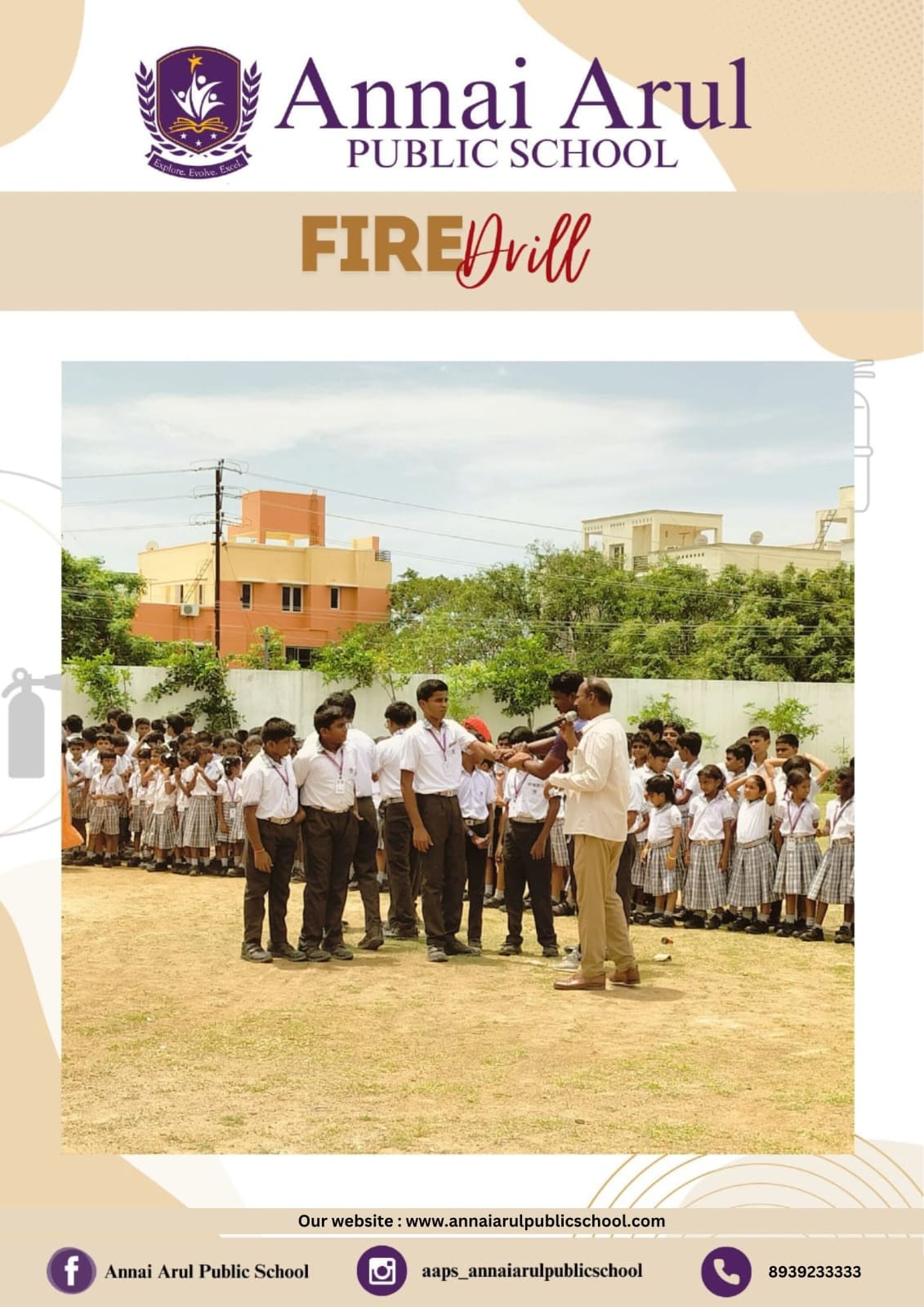 Annai Arul Public School conducted a fire drill to ensure our students and staff are prepared in case of an emergency. The drill was a simulated exercise to practice evacuating the premises safely and efficiently.