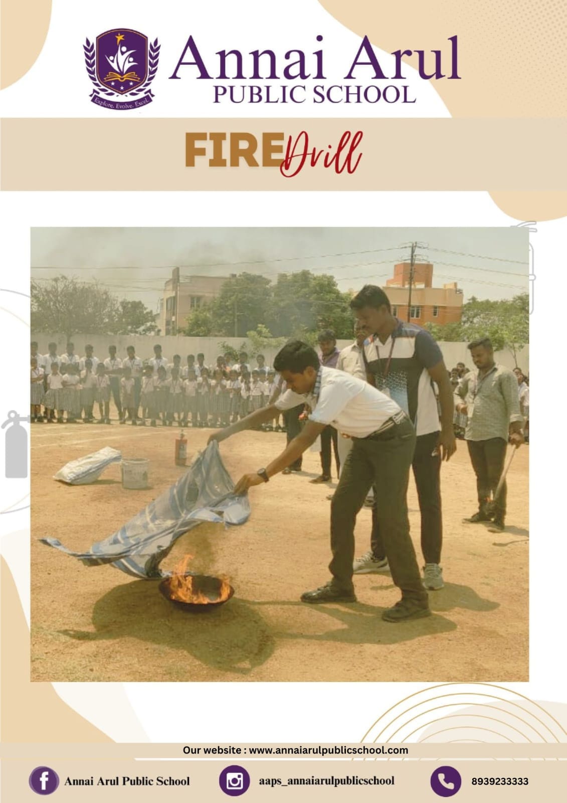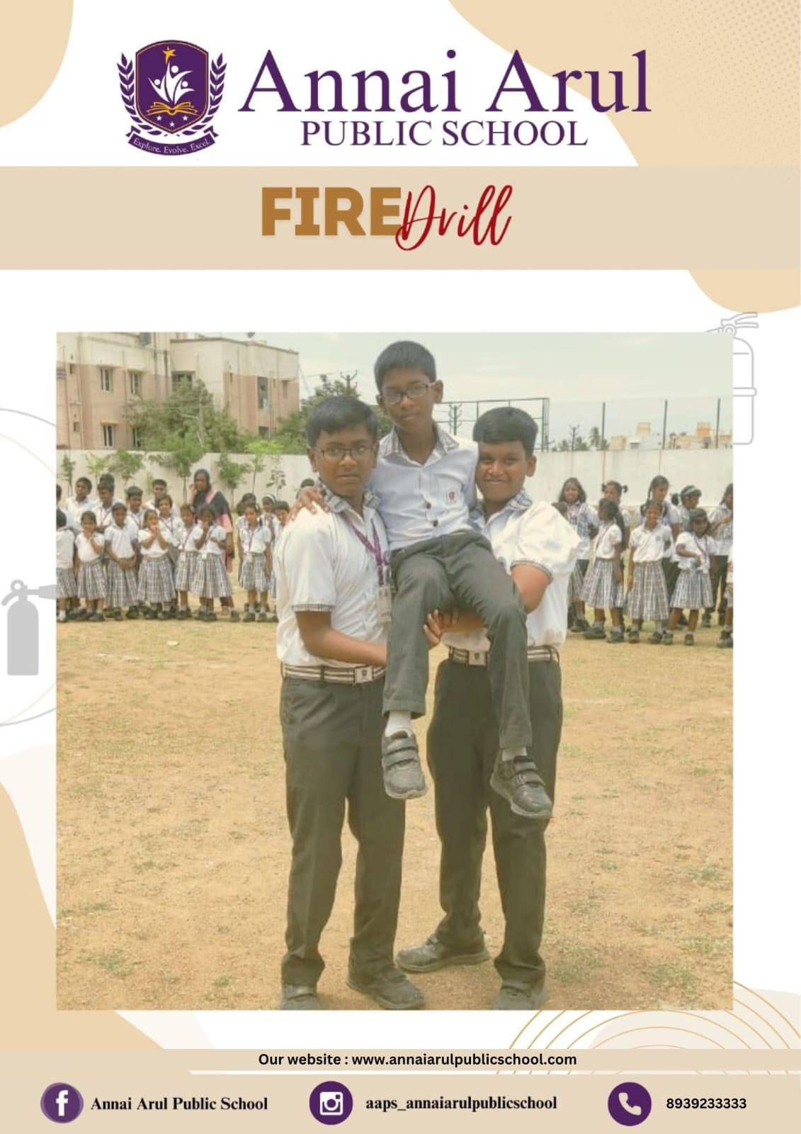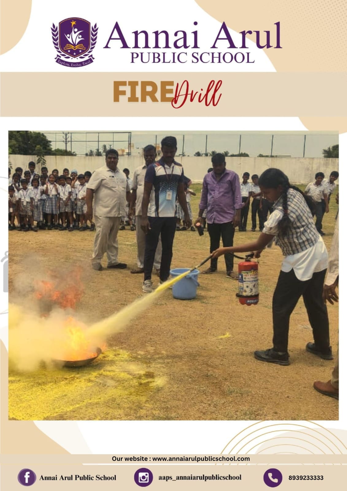 Annai Arul Public School conducted a fire drill to ensure our students and staff are prepared in case of an emergency. The drill was a simulated exercise to practice evacuating the premises safely and efficiently.