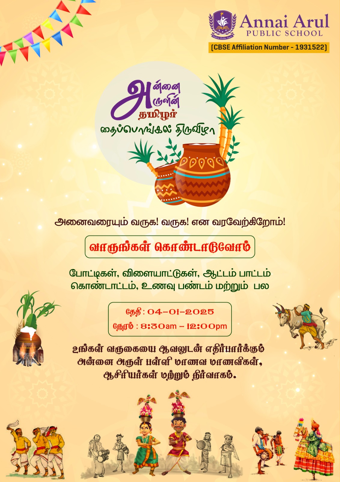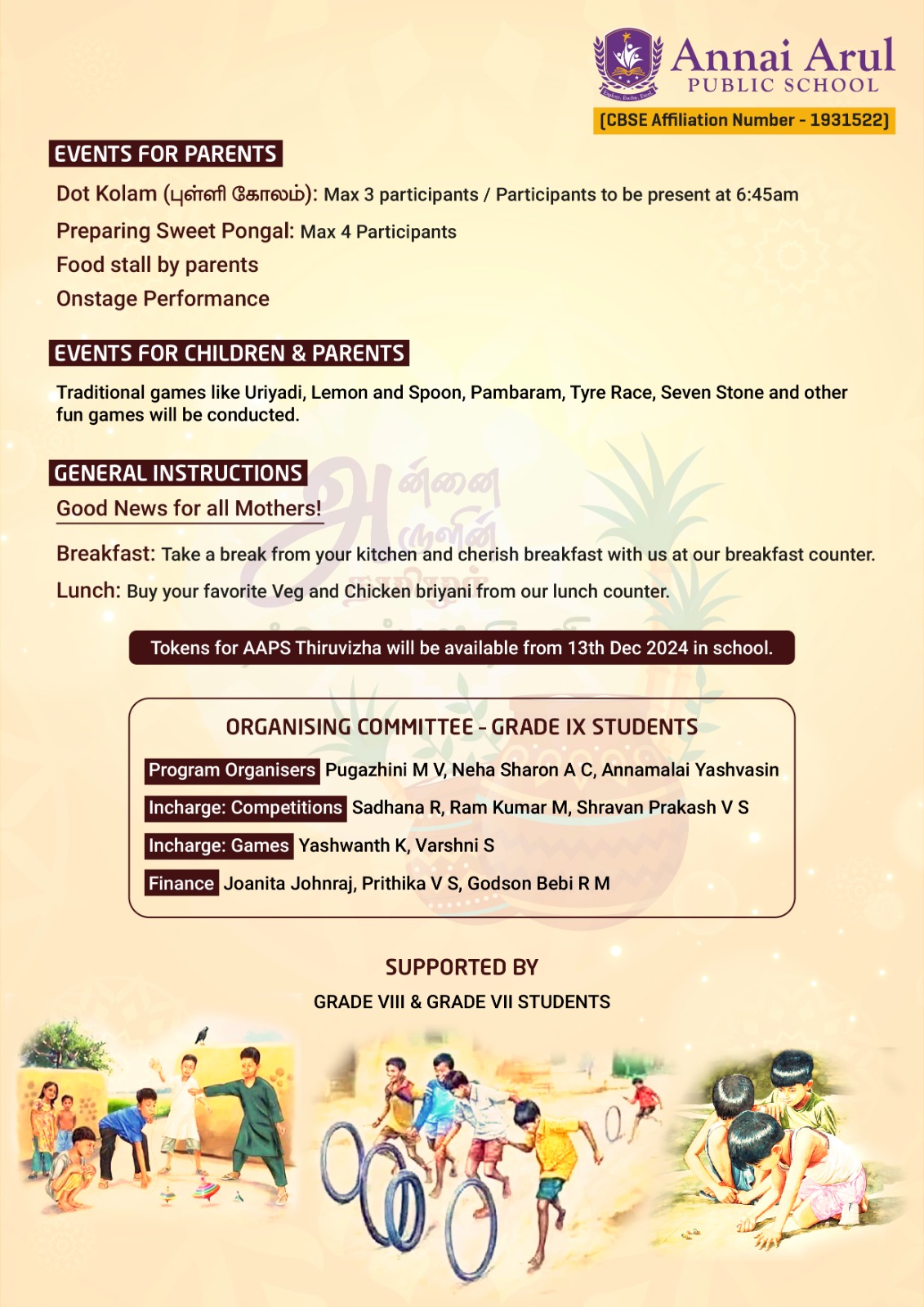 அன்னை அருளின் தமிழர் தைப்பொங்கல் திருவிழா will be organised by Grade IX students on 04-01-2025, from 8:30am to 12:00pm is Buzzing with Excitement!