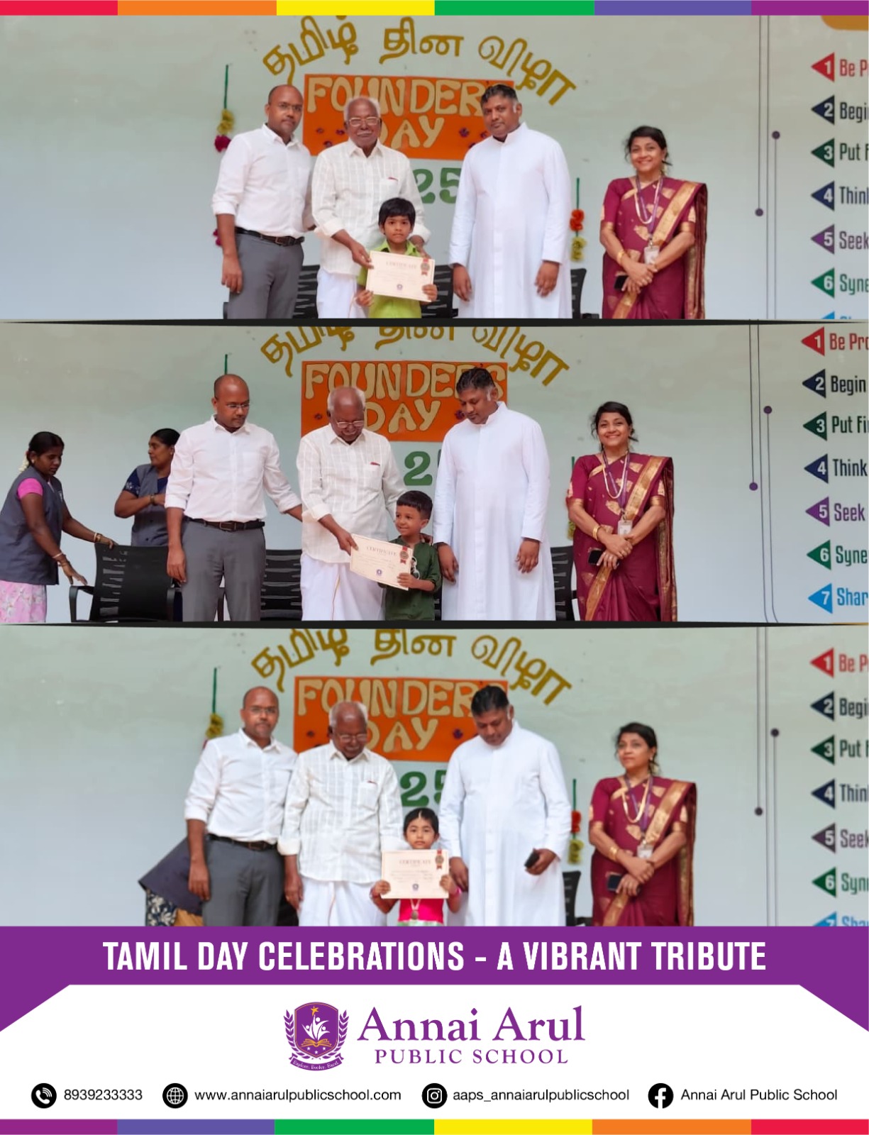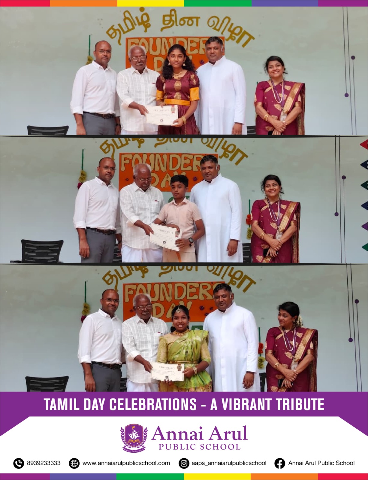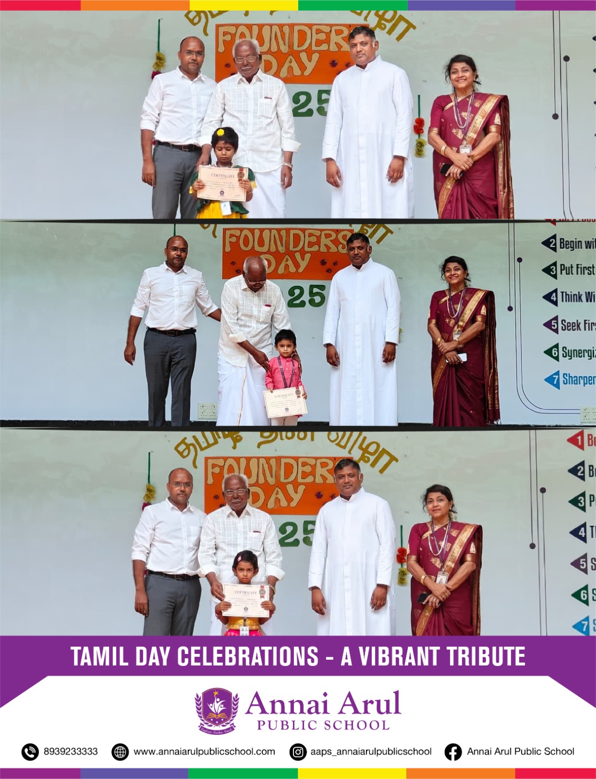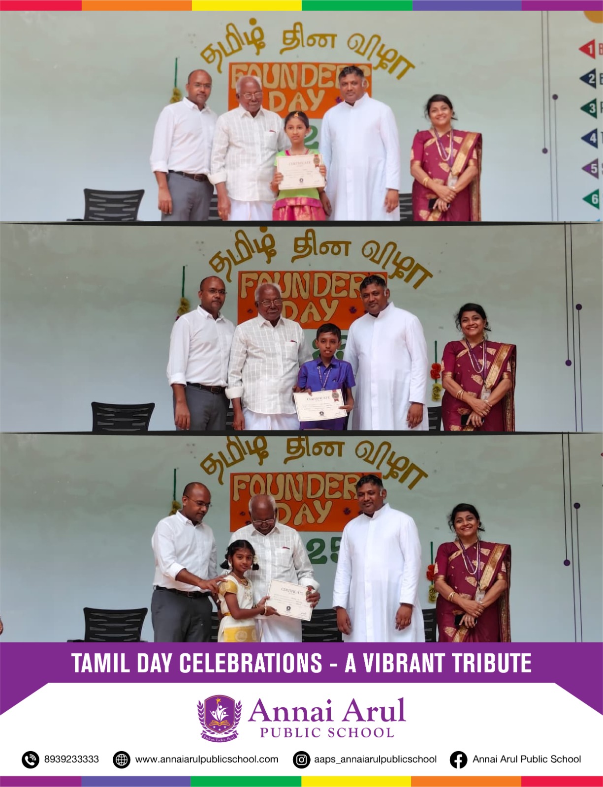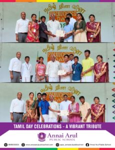 Annai Arul Public School proudly celebrated Tamil Day with fancy dress, elocution, essay writing, poetry, speech, children’s songs, and short film competitions.