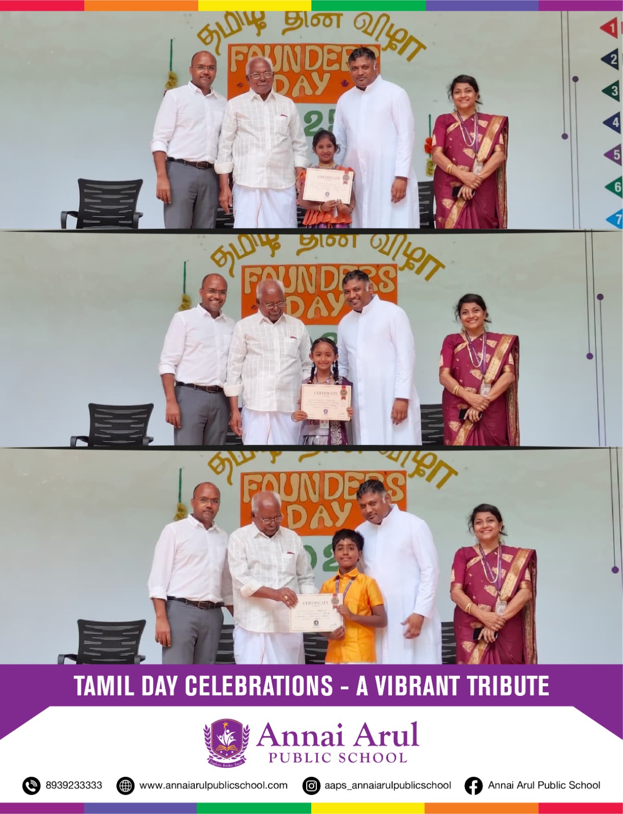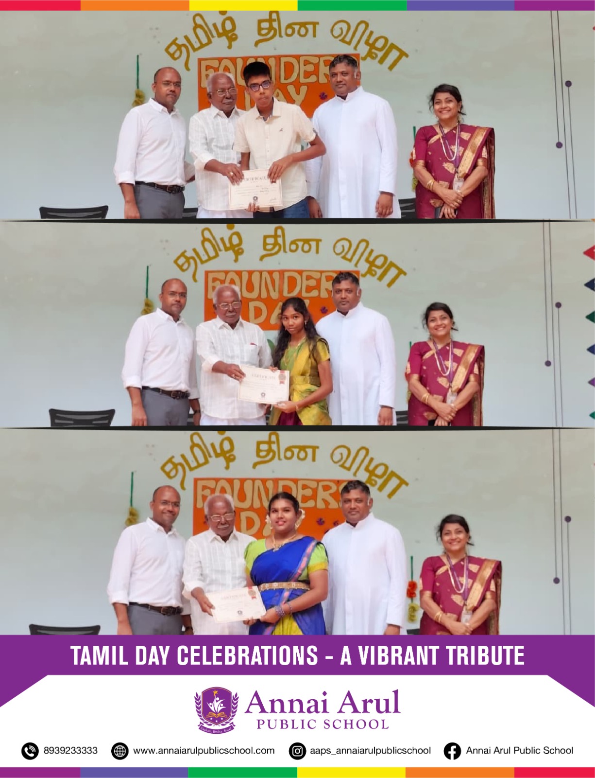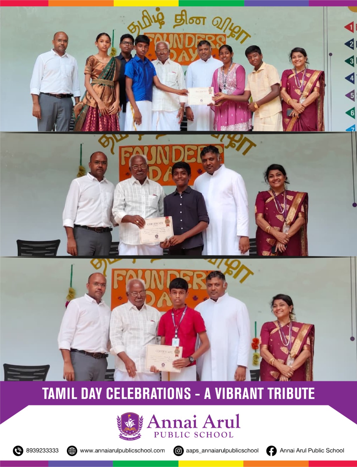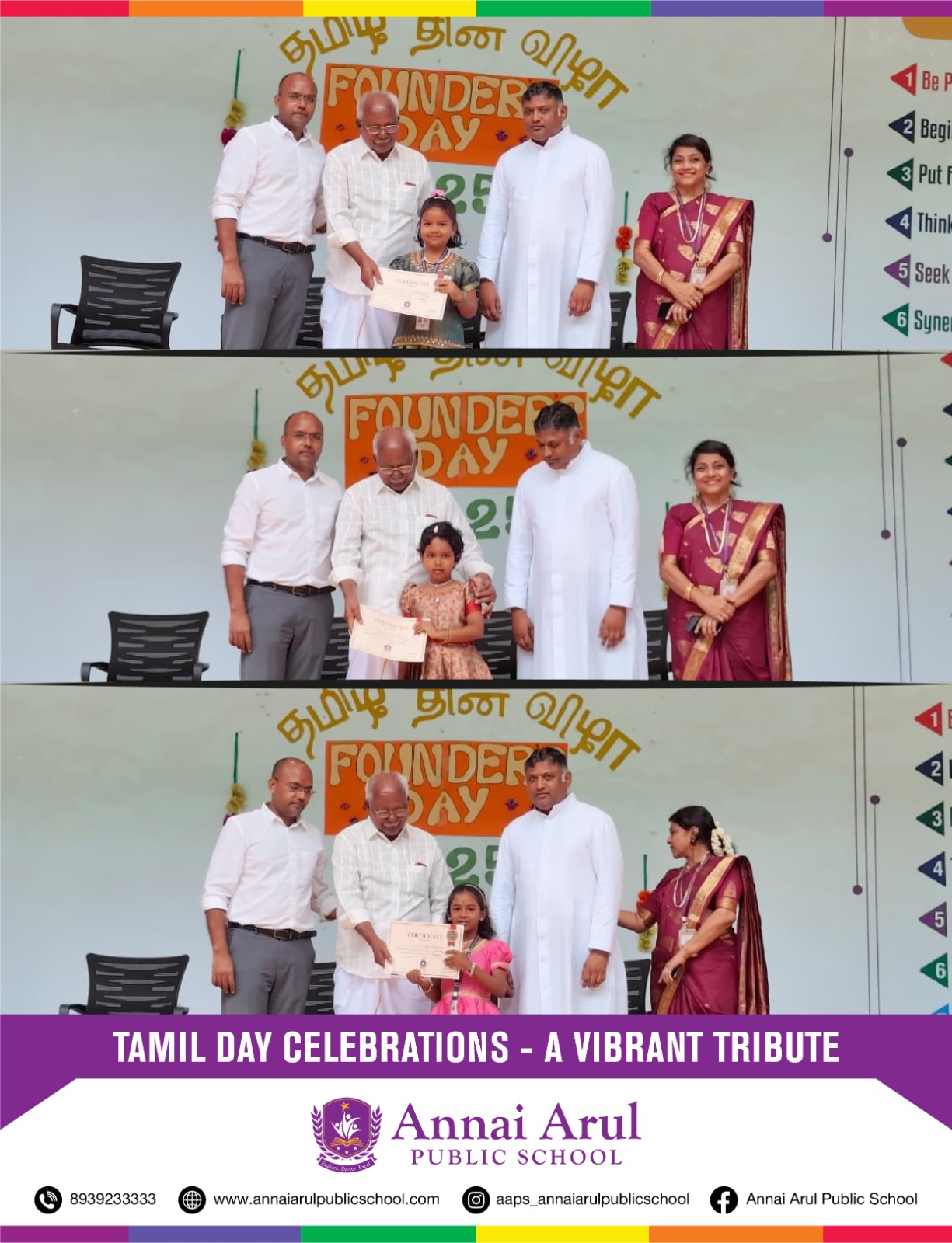 Annai Arul Public School proudly celebrated Tamil Day with fancy dress, elocution, essay writing, poetry, speech, children’s songs, and short film competitions.